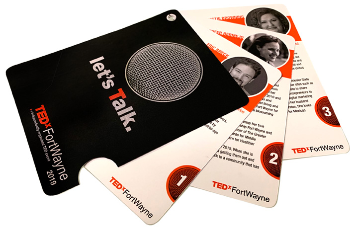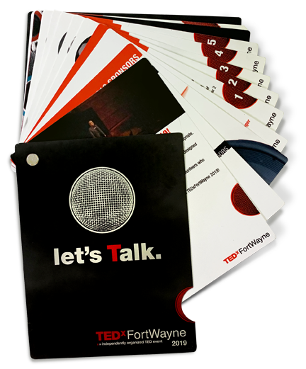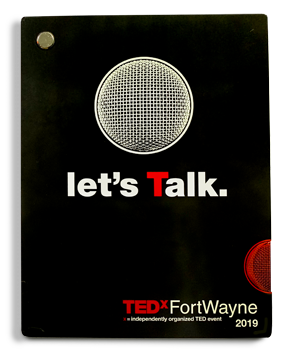 The above image is a mockup of the program for the upcoming TEDx Fort Wayne event (locally produced TED talks). It has a "silver-etch" (AKA MetalPhoto) process aluminum cover with poly wash red ink and digitally printed carolina board pages / digitally printed aluminum back cover bound by one Chicago screw in the upper left. The "silver etch" process exposes a photo-sensitive aluminum plate to light with the exposed areas producing a nice matte black. The poly ink wash is a translucent ink which will allow the ink color to lay above and change the color of the aluminum before being sealed, resulting in an indestructible metallic red. Produced by Prentice Products. Take a look below at the finished product.