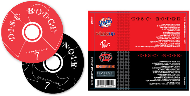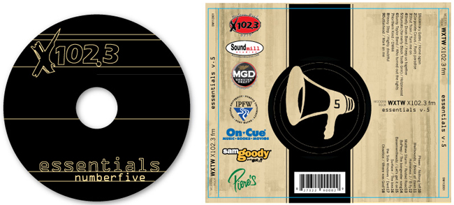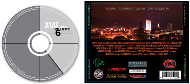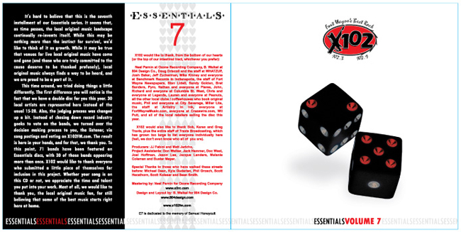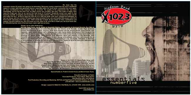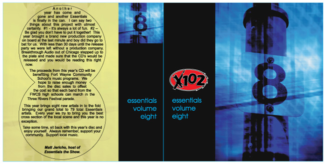 The Fort Wayne radio station X102 put out a CD annually (a few years back) of the best of local bands and tapped me to design the disc and packaging. This was volume 5. This only shows the outside of the CD booklet.