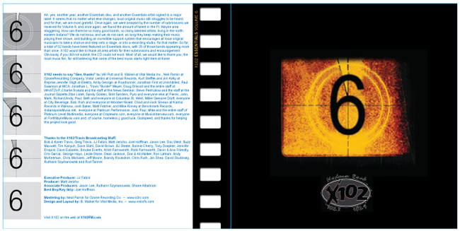 The volume 6 of the X102 Essentials CD (I'm proud to say I was part of one of the bands that made the cut). This only shows the outside of the CD booklet. I went with a movie theme on this one. Back cover photo was taken by me when I lived on the 13th floor of a downtown high rise apartment building.